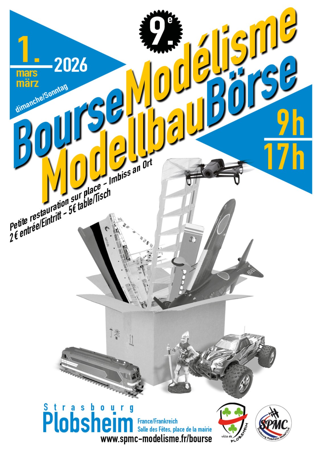 Chers amis modélistes, le 01/03/2026 le Strasbourg Plobsheim Model’club organise sa traditionnelle bourse internationale de modélisme à la salle des fêtes de PLOBSHEIM de 09 heures à 17 heures.